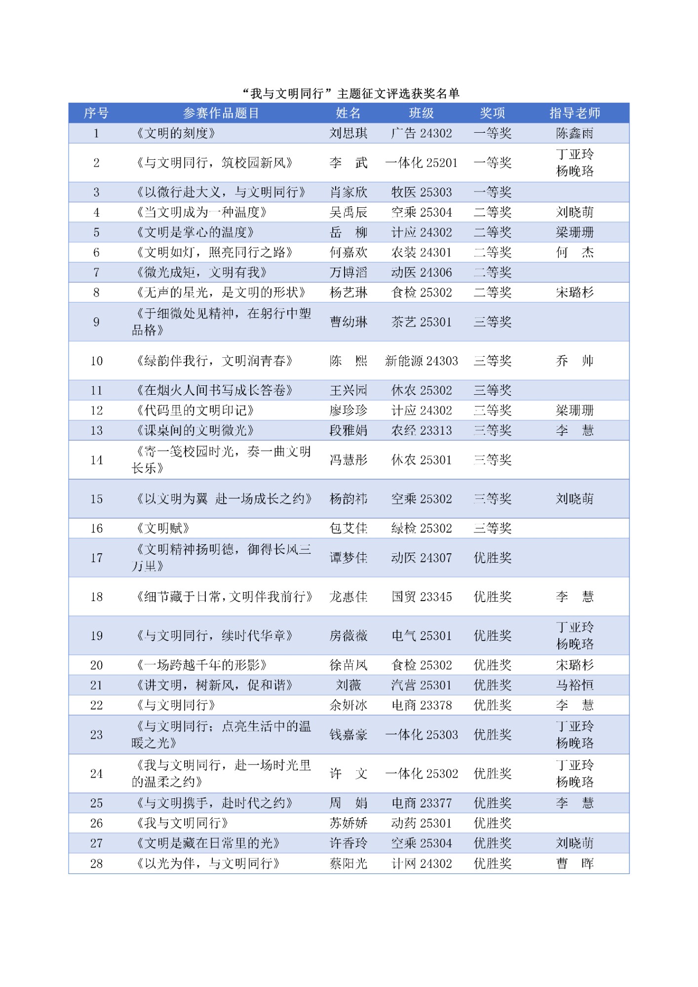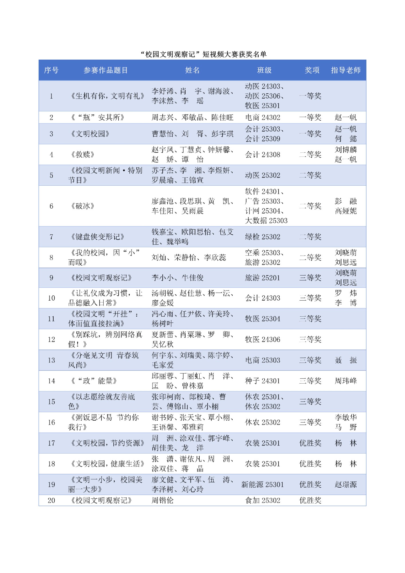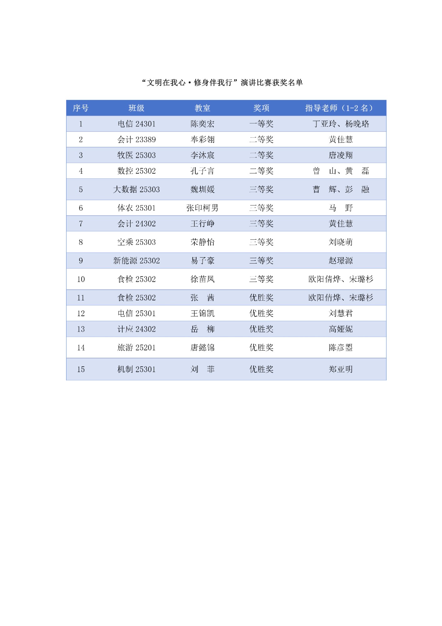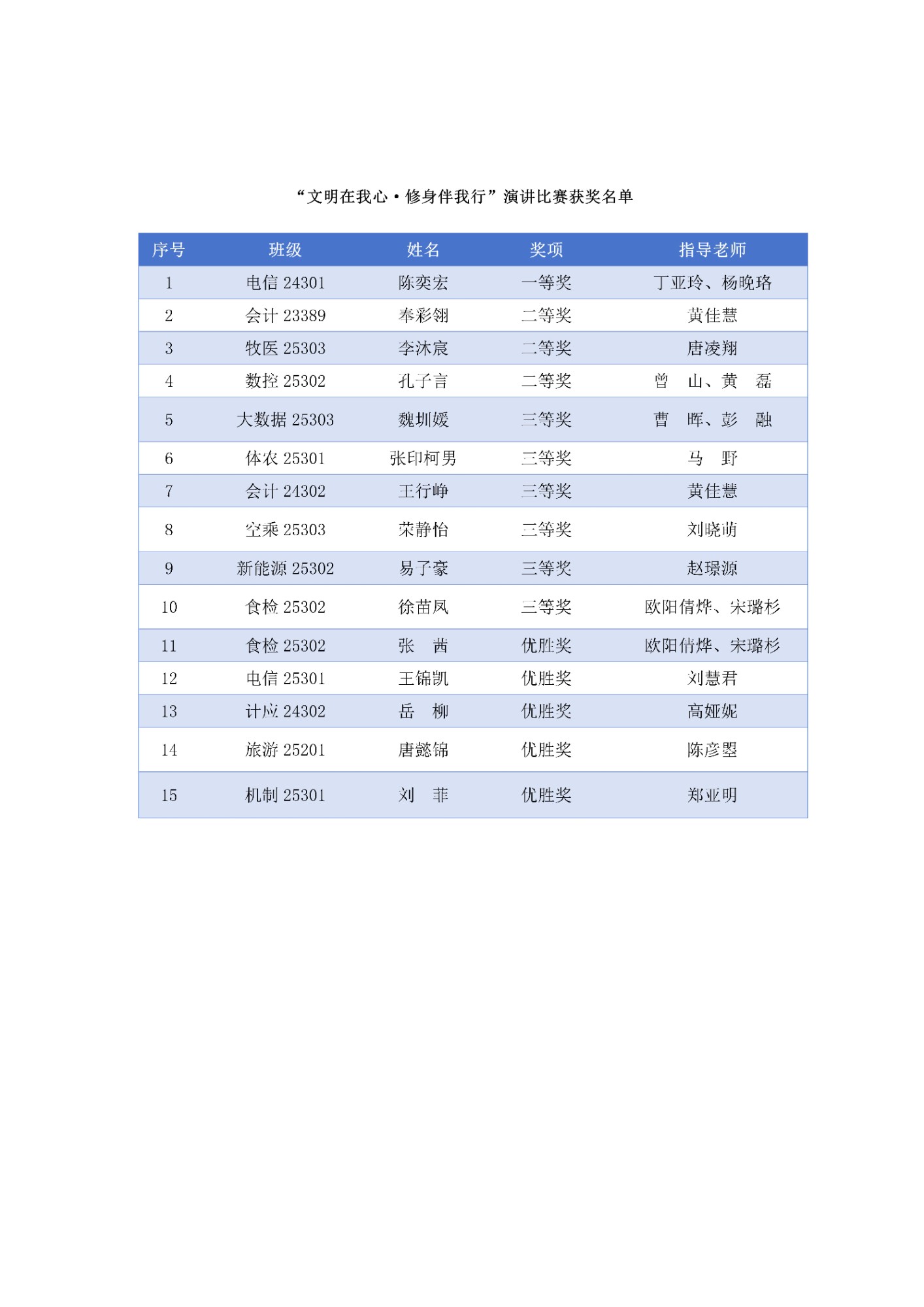 会上对“文明修身”主题月中开展的四大活动获奖集体及个人进行了集中表彰。系列活动形式多样、内涵丰富,包括“文明在我心·修身伴我行”演讲比赛、“倡文明新风·绘青春梦想”黑板报评选、“校园文明观察记”短视频大赛、“我与文明同行”主题征文评选。活动得到了广大青年学子的积极响应和广泛参与,涌现出一批优秀作品、案例和成果,集中展示了我校文明校园建设的丰硕成果和学子们良好的精神风貌。