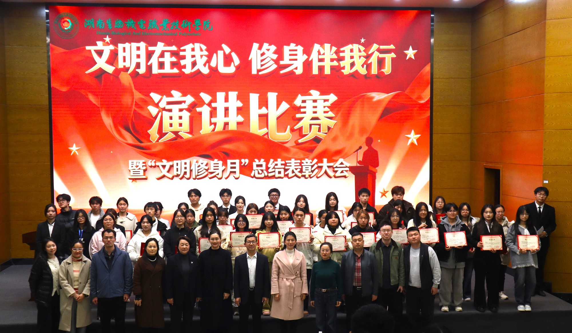 2025年12月10日晚,我校 “文明在我心·修身伴我行”演讲比赛决赛暨“文明修身”主题月系列活动表彰会在知新楼316报告厅顺利举行。学校党委委员、副校长廖良林,党委委员、宣传统战部部长龙雯,湖南现代物流职业技术学院团委书记唐鹰尼,校工会常务副主席谢鸿,校团委书记张珊,演讲协会指导老师刘慧君,校团委全体人员,各二级学院团总支书记、教师代表及学生代表齐聚一堂,共同参与了这场文明育人的成果展示与思想盛宴。